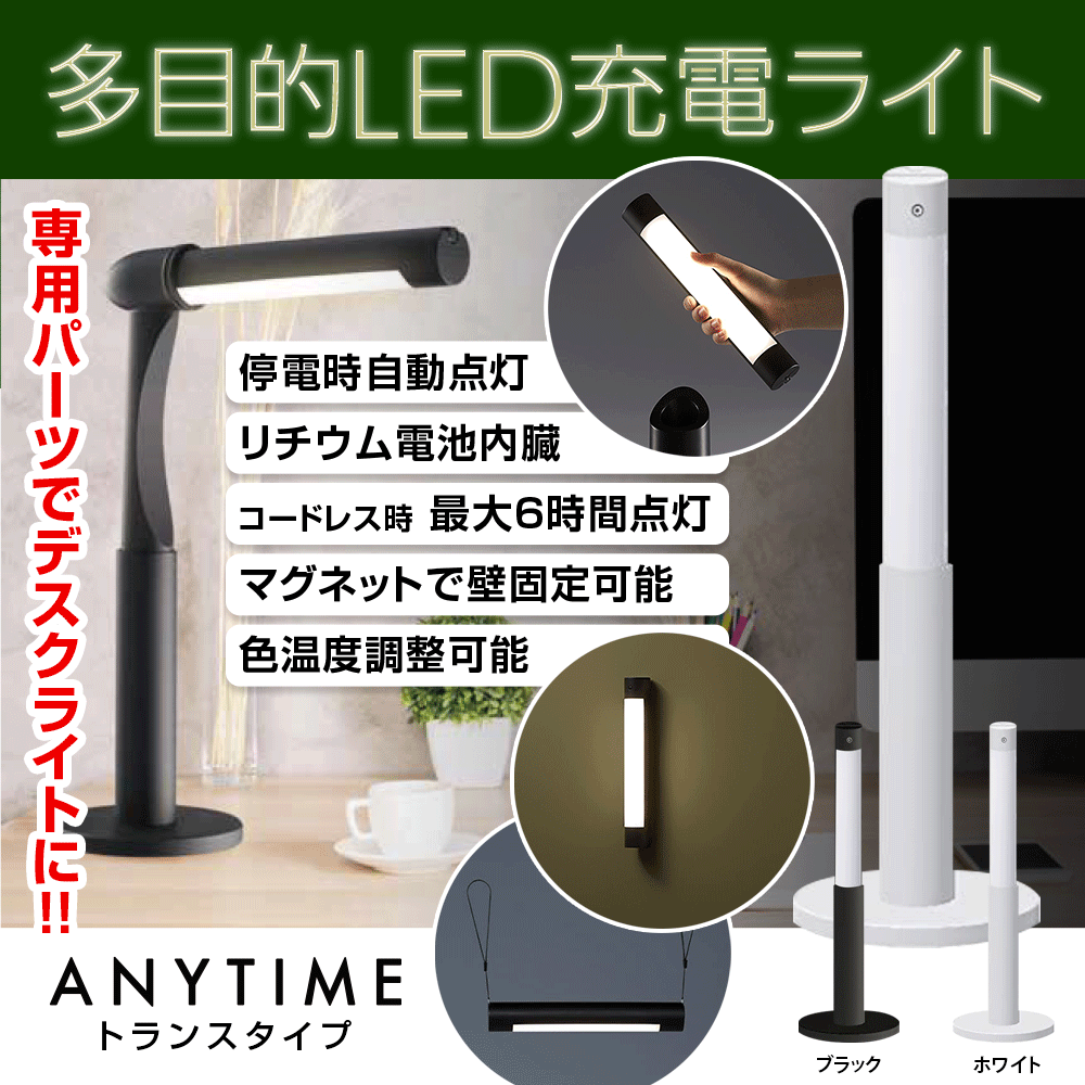 LEDライト 3WAY【TVでも絶賛】テーブルライト 懐中電灯 作業灯 エニータイム トランスタイプ 停電 自動点灯 ライト コードレス 充電式 anytime 災害 防災 屋内 屋外 調色機能| 調光 スタンドライト スタンド 卓上 卓上ライト 卓上照明 非常灯 防災グッズ led